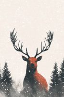 "Rode Hert in Sneeuwval" toont een silhouet van een statig hert met imposante gewei, gehuld in een magisch winterlandschap. De rode tint van het hert vormt een krachtig contrast tegen de zachte sneeuwvlokken die uit de hemel dwarrelen. Omringd door naaldbomen en mistige achtergronden, roept het kunstwerk een gevoel van mysterie en winterse betovering op. Dit schilderachtige tafereel vangt de rustige elegantie van de natuur tijdens de winter en is perfect voor liefhebbers van dieren en minimalistische kunst.