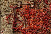 Klimop klimt op verlaten huismuren. Hier klimt de plant langs een ingebouwd raam, omlijst zijn ornamenten en zorgt voor een spetter van kleur. De bladeren van de klimop hebben met het aanbreken van de herfst verschillende tinten goud en rood gekregen en zijn veranderd in een deken van roest en koper. Er zijn ook blootliggende takken, waar de bladeren zijn gevallen, waardoor een aderachtige textuur op de muren ontstaat. Zowel het gebladerte als het oude gebouw verwijzen naar het verstrijken van de tijd en de wisseling van de seizoenen. Een perfecte omhelzing tussen natuur en organische architectuur.