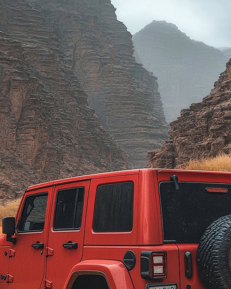 Een rode Jeep Wrangler baant zich een weg door de woestijnduinen onder een vurige zonsondergang. Hij stuift goudkleurig zand op en baant zich een weg door de woeste wildernis. Een gedurfd symbool van vrijheid, kracht en de geest van verkenning.