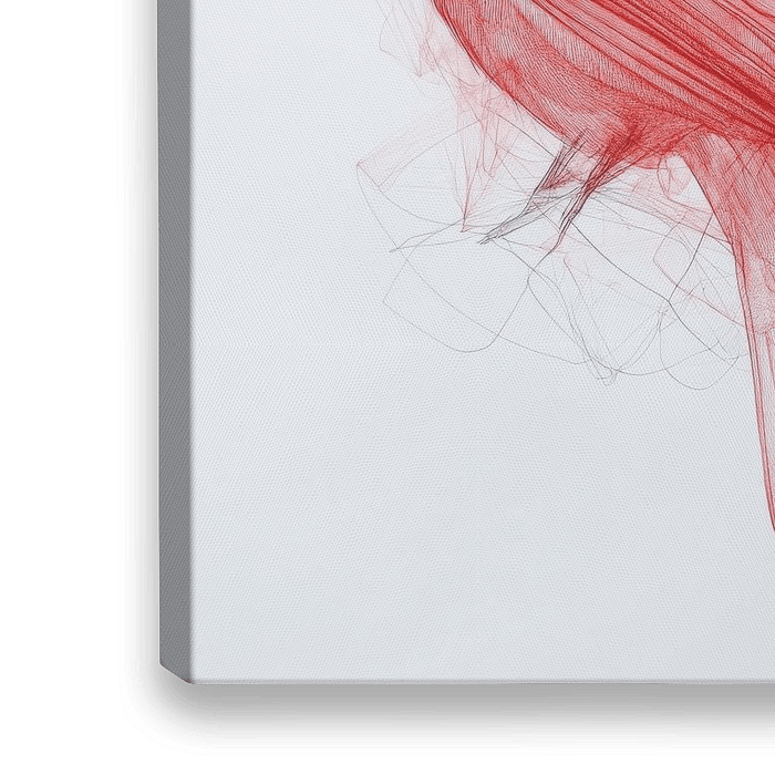 Deze kunstzinnige weergave van een rode kardinaal combineert realisme met abstracte expressie. De vogel is gedetailleerd weergegeven met delicate rode en zwarte lijnen, die lijken te vervloeien in een dynamische, etherische compositie. De subtiele abstracte achtergrond voegt een moderne en dromerige uitstraling toe, terwijl de heldere…