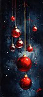 Rode Kerstballen - Dit Kerstmis schilderij toont sprankelende rode kerstballen die hangen tegen een donkerblauwe achtergrond, versierd met gouden lijnen en spetters witte en rode verf.