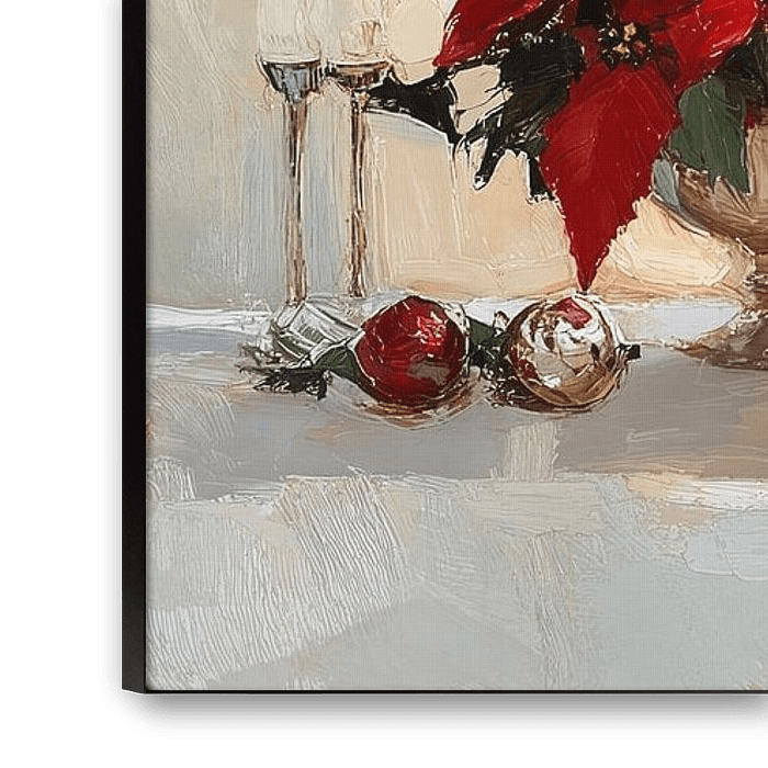 Rode Kerststerren en Kaarslicht - Dit kerst schilderij toont een groep levendige rode kerststerren in zilveren potten, omringd door brandende kaarsen en kerstballen, uitgevoerd in een impressionistische stijl met dikke verfstreken en warme tinten.