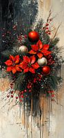 Rode Kerstversiering - Dit Kerst stilleven schilderij toont een levendige samenstelling van rode, traditionele Kerststerren en glanzende, goudkleurige kerstballen genesteld tussen dennentakken en rode bessen, alles tegen een ruw, getextureerd achtergrond met grijze en beige tinten.