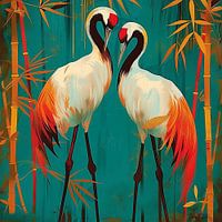 Deze kleurrijke kunstprint toont twee kraanvogels die elkaar liefdevol naderen, geplaatst tegen een diepe turquoise achtergrond met gouden bamboe. De vogels stralen elegantie en mystiek uit, met een modern-oosterse flair. Hun oranjerode veren steken prachtig af tegen het koele groenblauw.