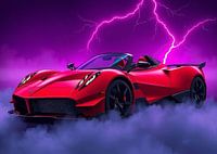 De rode Pagani Huayra Roadster raast door een gang van neon-magenta mist, zijn rondingen verlicht als gesmolten metaal. De rook kringelt achter hem aan en de bliksem breekt de hemel in chaotische schittering. Donder pulseert door de nevel terwijl de Huayra de storm commandeert, een levende vlam in een neon droomlandschap.