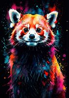 Een levendig aquarelschilderij van een rode panda tegen een donkere achtergrond, met neonaccenten die de kenmerkende vacht en speelse uitdrukking van de panda benadrukken. Het contrast tussen de levendige kleuren en de diepe achtergrond creëert een opvallend visueel effect, dat de charme en eigenzinnigheid van dit geliefde dier vastlegt. De vloeiende penseelstreken en heldere kleuren roepen een gevoel van beweging en leven op, waardoor de rode panda het middelpunt wordt van dit betoverende kunstwerk.