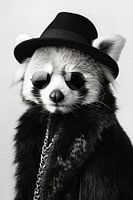 Zwart-witfoto van een rode panda met pet en bril, gekleed in een urban hiphopstijl met kettingen.