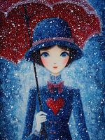 Rode Paraplu | Hart Paraplu - Het werk opent met twee heldere aandachtstrekkers: een meisje met grote, bijna porseleinen blauwe ogen en een opvallend rood hart en rode paraplu die samen één speelse kerst-twist vormen. De compositie zet die twee elementen tegenover elkaar: het gezicht, zacht en helder belicht, trekt je als een magneet, terwijl het rood van de paraplu en het hart meteen een warme noot van feestelijkheid en knipoog toevoegt in het koude winterpalet. Dit is een surrealistisch winter schilderij dat speelt met contrasten — koel blauw versus warm rood — en precies daardoor vrolijk binnenkomt, zoals een kerstkaart met een eigenzinnige glimlach.