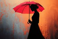 De foto toont een donkere silhouet van een vrouw met een felrode paraplu, gehuld in een mantel, die uitsteekt tegen een gloedvolle, intense zonsonderganglucht in warme tinten zoals oranje en rood. Het beeld straalt een serene, melancolieke maar ook mysterieuze en betoverende sfeer uit.