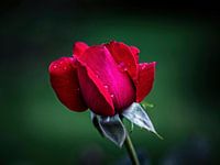 Opvallend diep rode kleur van deze rozenknop nog nat van de dauw.