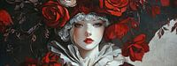 Rode Rozen | Rode Rozen - Dit vrouwen schilderij toont een sereen vrouwengezicht met gesloten ogen en felrode lippen, omringd door weelderige grote rode rozen en donkere bladeren, geaccentueerd door witte en zwarte details in haar kleding onder een kanten hoofdband.