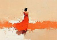 Rode Rust - Dit abstracte schilderij stelt een vrouw in een levendige rode jurk centraal, uitgebeeld tegen een rustige, zachtoranje achtergrond, waarbij de eenvoud en de vloeiende lijnen een gevoel van rust en kalmte uitstralen.
