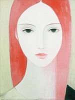 Rode Stilte - In één oogopslag valt twee dingen het meest op: het porseleinen gezicht dat het doek domineert en de lange rode haarpartij die het gezicht als een zachte sluier omlijst. Dit vrouw schilderij toont geen druk gebaar, maar een afgemeten stilte — alsof het portret een kamer binnengaat en zachtjes het licht dimt. De huid is zo…