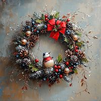 Rode Strik - Dit is een krans schilderij, een schilderij krans van een moderne kerstkrans met een grote rode strik in het midden, omringd door dennenappels, hulstbladeren en rode en blauwe bessen met een klein vogelornament, geschilderd in dikke verf en een impressionistische, moderne stijl met sneeuwaccenten.