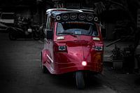De achtergrond is onscherp en grotendeels in zwart-wit of gedesatureerd, met hints van andere voertuigen en gebouwen, waardoor de rode kleur van de tuk-tuk extra opvalt.
