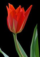 Rode Tulp Bloem Abstract Low Poly in abstracte illustratiestijl. Ik wil bloemen op een andere manier beschrijven. Bloemen in abstracte kunststijl, abstracte illustratie. Rode tulpenbloesem op zwarte achtergrond met groene bladeren.