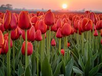 Een veld met rode tulpen die kleurig zijn bij een zonsondergang