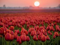 Een veld met rode tulpen die kleurig zijn bij een zonsondergang