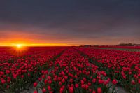 Terwijl ik mijn camera richt op het uitgestrekte tulpenveld voor me, voel ik de warme gloed van de ondergaande zon op mijn gezicht. De rode tulpen staan prachtig in bloei, badend in het zachte avondlicht. Met elke klik van mijn sluiter probeer ik de levendige kleuren en de serene sfeer van dit moment vast te leggen. Een zachte bries draagt de zoete geur van de bloemen met zich mee, terwijl de laatste zonnestralen de tulpenblaadjes omhullen. Het is een betoverend schouwspel, een moment van pure harmonie tussen mens en natuur dat ik koester en graag deel met anderen door mijn foto's.