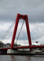 Karakteristieke rode Willemsbrug die het Noordereiland met de Maasboulevard in Rotterdam verbind. De brug hangt over de rivier de Maas.