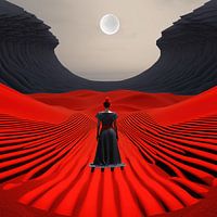 Een vrouw in een zwarte jurk staat in een rode woestijn onder een volle maan, waardoor een gevoel van mysterie en intrige ontstaat.