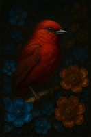 Deze betoverende rode vogel springt krachtig uit een donker bloemendecor met rijke blauwe en koperkleurige tinten. De intieme sfeer en verfijnde details geven het werk een schilderachtige, bijna oude-meesterlijke uitstraling.