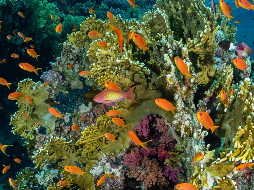Dit prachtige kleurrijke tafereel is een typisch beeld uit de Rode Zee. Zachte en harde koralen zorgen voor een grote kleurenpracht.