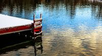 Rode ladder aan een besneeuwde houten steiger, met gouden en blauwe luchtreflecties op rimpelend water. Rustig en sfeervol.