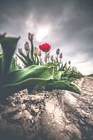 Rode afwijkende tulp op veld onder donkere wolken van Fotografiecor .nl