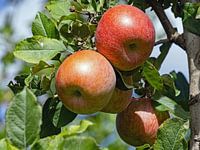 Close-up van vier rode appels aan een appelboom in Zuid-Tirol