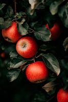 Sappige, roodgloeiende appels hangen zwaar aan dicht, groen gebladerte. Hun heldere kleur springt er levendig uit en belooft zoete verwennerij. Omringd door tere bladeren lijken ze te glinsteren in de warme zon, een verleidelijke uitnodiging om te oogsten en een feest voor de zintuigen. Een klein natuurwonder vol frisheid en vitaliteit.
