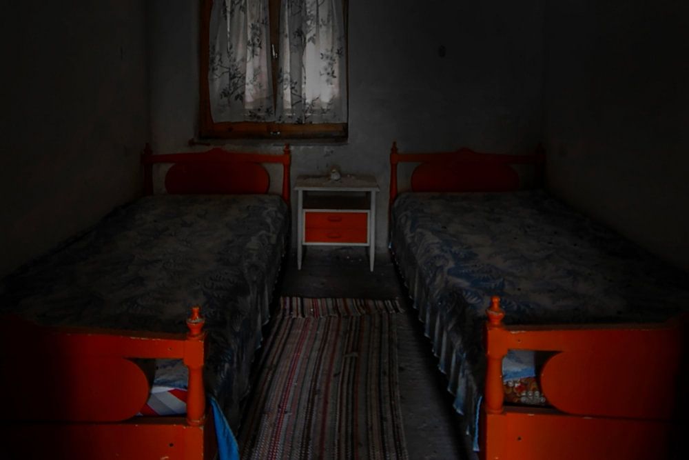 In een verlaten huis, ergens in Europa, staan deze rode bedjes. Een mysterieus inkijkje dat een beetje luguber aandoet zo in het halfdonker...Wat is de historie van deze kamer, wie hebben hier geslapen, gespeeld, gedroomd. Wat stond er op het nachtkastje...