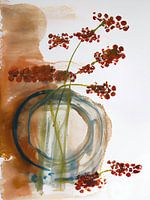 Aquarel van rode besjes in een surrealistische abstracte vaas. Rond, doorzichtig en blauwe lijnen. Terra en wit op de achtergrond. Passend bij diverse trends en stijlen. koraaltinten. Bruin, blauw, wit, rood. Modern abstract. Botanisch.