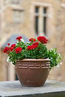 Rode bloeiende geraniums in een bloempot op een muur op de binnenplaats van een oud huis. Ik fotografeerde deze bloempot op de binnenplaats van kasteel Wernigerode in Duitsland. Geraniums zijn niet mijn favoriete bloemen, maar ik vind dat de bloemen heel goed uitkomen met de onscherpe achtergrond.