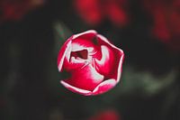 Boven aanzicht van een rood met witte tulp en een zacht focus verlopen. Bloeiende voorjaarsbloem met een onscherpe dof achtergond en een vintage stijl. Fine art fotografie van natuurlijke onderwerpen in het Nederlandse landschap.