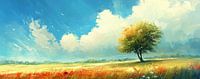 Rode bloemen en blauwe lucht - Op dit landschap schilderij zie je een grote boom met groene bladeren, die aan de rechterkant staat, terwijl rode en witte bloemen de onderste helft van het schilderij vullen onder een heldere blauwe lucht met fluffy wolken.