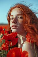 De foto toont een indrukwekkende jonge vrouw met stralend rood haar, omlijst door felrode klaprozen. Haar gelaatstrekken zijn zacht en versierd met talloze sproeten, wat haar een bijzondere levendigheid geeft. Het contrast tussen de blauwe lucht en de rode bloemen benadrukt de emotionele diepte van het tafereel.