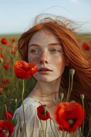 Midden in een knalrood klaprozenveld schittert een meisje met felrood haar en sproeten. Haar zachte gezichtsuitdrukking en de vloeiende haarlokken die dansen met de wind creëren een harmonieuze verbinding met de omringende natuur. De heldere klaprozen vormen een fascinerend contrast met haar bleke huid en levendige blauwe ogen.