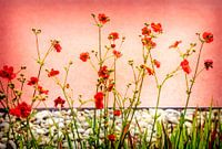 Koop dit bloemen kunstwerk Rode bloesems voor een roze muur van Leopold Brix op canvas, aluminium dibond, (ingelijste) fotoprint, behang en ArtFrame, op maat geprint in Fine-Art kwaliteit.
