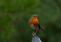 Roodborstje op een stronk met groene achtergrond. Geen zeldzaam vogeltje, maar het blijft een prachtige verschijning. Als bekend vogeltje in Nederland verdient dit kleurrijke beestje natuurlijk een plekje aan de muur!