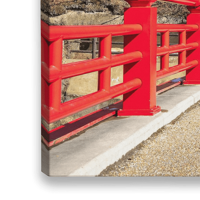 Brug met rode railing dat verbonden is met een eiland in Matsushima Bay in de buurt van Sendai in Japan tijdens een zonnige winterdag. Eiland heeft rots bewerkingen en een klein tempeltje.