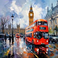 De typische rode bussen in Londen voor de Big Ben. Een digitaal kunstwerk dat eruitziet als een schilderij.