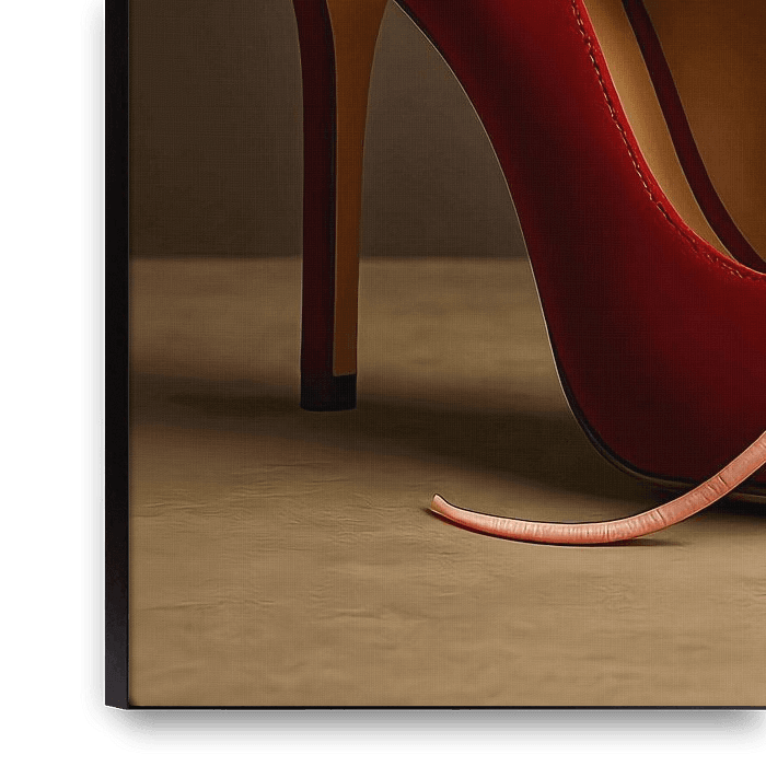 Een klassieke rode damespump met een onverwachte twist: uit de opening van de damesschoen gluurt een witte muis, terwijl haar lange staart als een veter door de gaatjes van de pump is geregen. Deze surrealistische compositie speelt met contrasten – verfijning en speelsheid, mode en dier, vrouwelijkheid en fantasie.