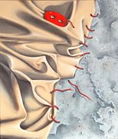 Het schilderij is gemaakt in een surrealistische stijl. Is het mogelijk om textiel en steen aan elkaar te naaien? Het is verbazingwekkend, maar alles is mogelijk in mijn fantasie versie.