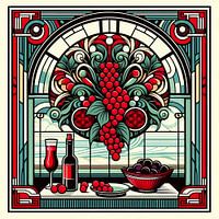 An ornate stained glass window features a vibrant display of grapes and swirling foliage, creating a striking centerpiece. Below the window, a table is set with a wine glass, a bottle, and a bowl of fruit, enhancing the sense of luxury.