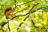 Deze rode eekhoorn liet zich goed zien tussen het verkleurende herfstblad. Dit beweeglijke dier die veelvuldig klimt en springt in bomen zat heel even stil om te poseren.