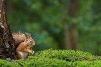 Rode eekhoorn (Sciurus vulgaris) zit bij een boomstam midden in een bos. Op de voorgrond is een met mos begroeide bodem te zien, waarop de eekhoorn zit. In de achtergrond is de waas van een boomstam en begroeiing te zien.