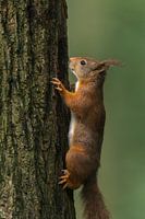 Rode eekhoorn (Sciurus vulgaris) klimmend in een boom. De achtergrond wordt mooi groen gekleurd door een in de verte staande boom.