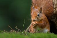 Portret van een rode eekhoorn (Sciurus vulgairs) die op de bosbodem zit te eten. De bodem van het bos is begroeid me mossen.