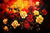 Dit prachtige schilderij met een weelderige compositie van rode en gele rozen brengt warmte en elegantie in elke ruimte. De vurige achtergrond met tinten van oranje, rood en geel creëert een dramatisch contrast met de donkere bladeren en bloemen, waardoor het kunstwerk een krachtig en expressief karakter krijgt. Perfect voor de woonkamer, hal of kantoor, dit stuk voegt een vleugje luxe en natuur toe aan uw interieur. Het is een ideaal cadeau voor bloemenliefhebbers en kunstverzamelaars.